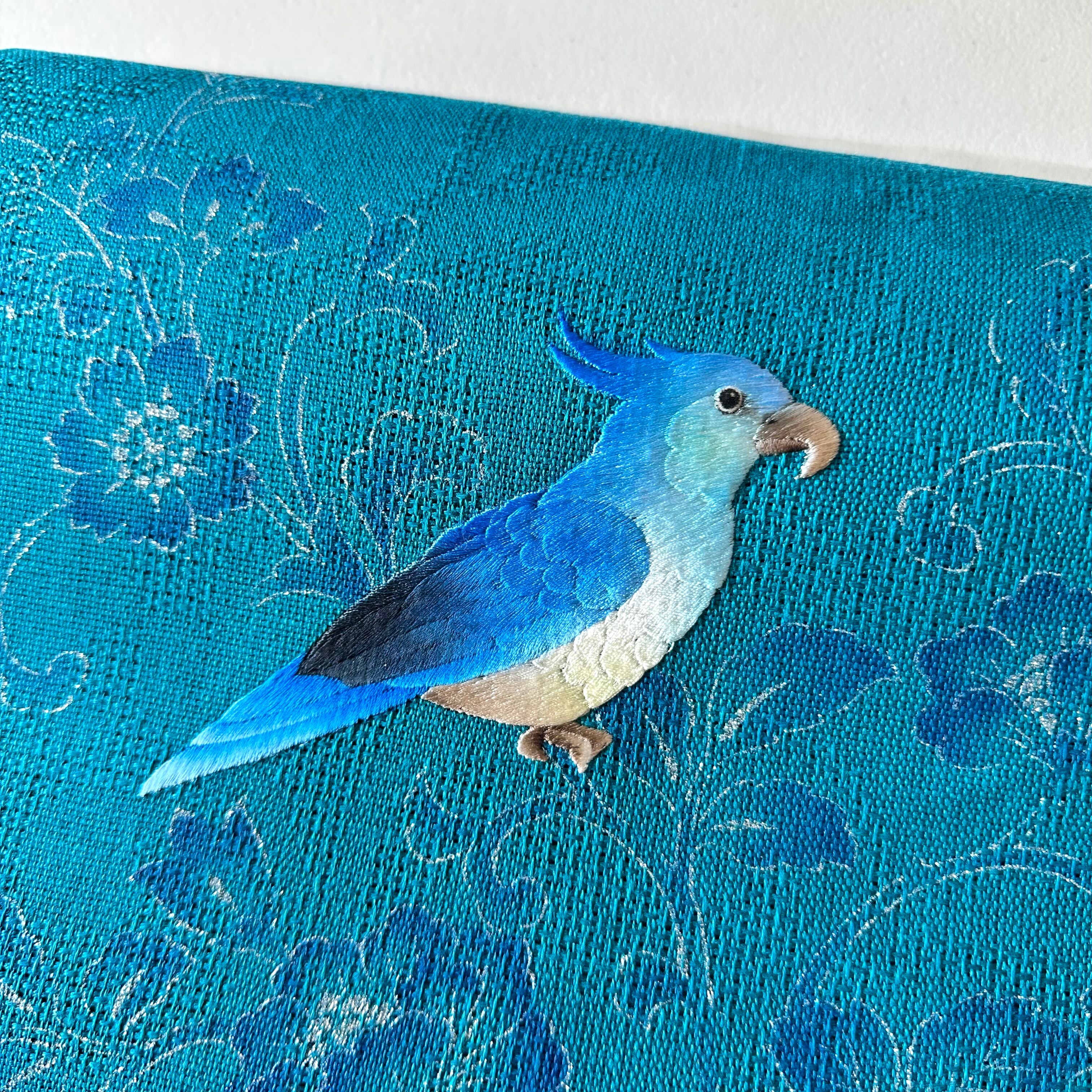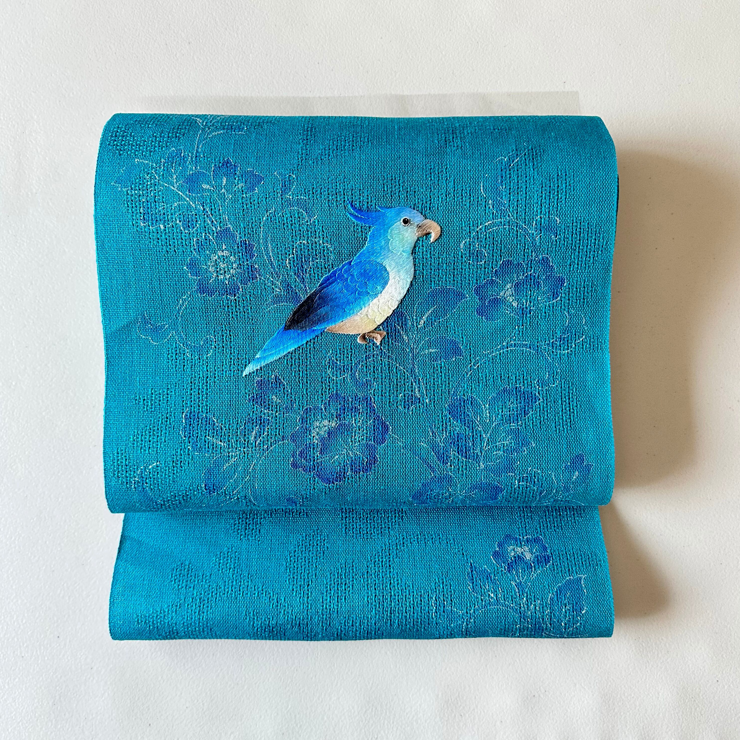 お太鼓のオウムは横振り刺繍。